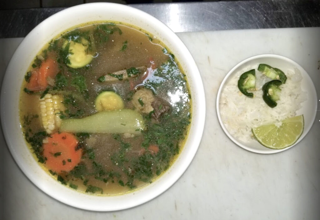 Lightly spiced beef stew with plantains, yucca, corn and fresh vegetables
