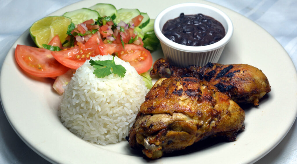 Served with rice, beans, and vegetables