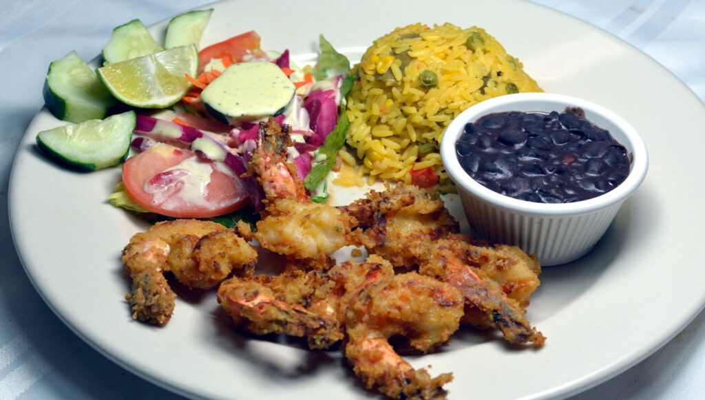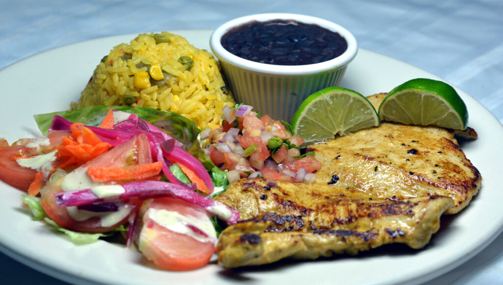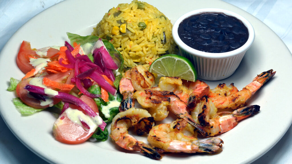 New York Steak grilled chicken, Salmon, and shrimp served with rice & beans