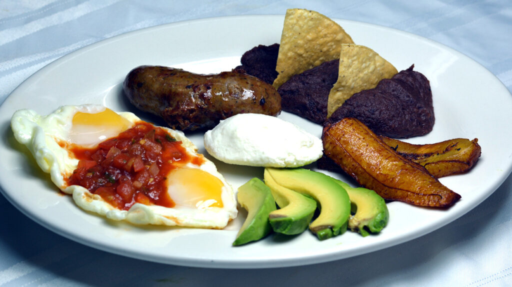 Combination of steak sausage, cheese, avocado, plantains, Pico Gallo, Rice, and beans