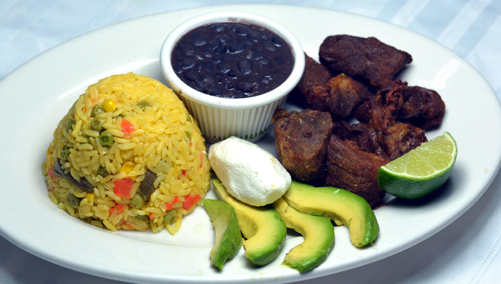 Refried pork served with rice, beans, and avocado